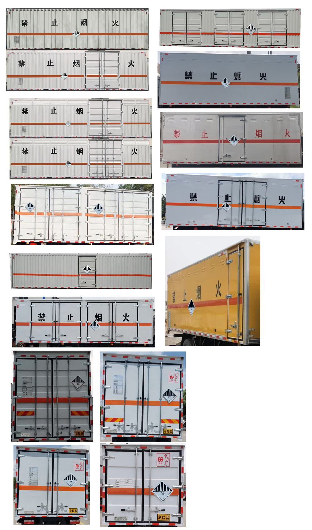 其它 | 1、該車適用于危險品運(yùn)輸,類項號:9。廂體頂部封閉,不可開啟。2、側(cè)、后防護(hù)材料均為Q235,側(cè)防護(hù)螺栓連接;后防護(hù)焊接,截面尺寸120×50mm,下邊緣離地高450mm。3、僅采用軸距(mm):4700,5150。僅選用排氣管前置、限速裝置(限速80km/h)、前輪盤式制動及子午線輪胎的底盤;安裝帶有衛(wèi)星定位功能的行駛記錄儀;ABS系統(tǒng)型號/生產(chǎn)企業(yè)對應(yīng)關(guān)系:ABS-E/威伯科汽車控制系統(tǒng)(中國)有限公司;ABS/ASR-24V-4S/4M/東科克諾爾商用車制動系統(tǒng)(十堰)有限公司;CM4XL-4S/4M/廣州瑞立科密汽車電子股份有限公司;3550D-1010/東科克諾爾商用車制動系統(tǒng)(十堰)有限公司.采用的發(fā)動機(jī)與油耗值(L/100Km)對應(yīng)關(guān)系為:F4.5NS6B220/24.4,B6.2NS6B210/26。該車轉(zhuǎn)向輪安裝輪胎爆胎應(yīng)急防護(hù)裝置,后軸采用空氣懸架。該車型可選裝ETC車載裝置.隨底盤選裝駕駛室。廂體側(cè)面選裝開門型式及位置,選裝不帶側(cè)開門,選裝瓦楞板或平板結(jié)構(gòu);廂體側(cè)面板選裝開百葉窗。選裝后尾板時,后防護(hù)材料為Q235,焊接,截面尺寸120×50mm,下邊緣離地高450mm。尾板收起狀態(tài)水平長度為290mm,尾板質(zhì)量為550kg。選裝制冷機(jī)組,選裝燃油箱,電瓶,尿素罐,后處理,儲氣筒左右安裝位置。 | ||